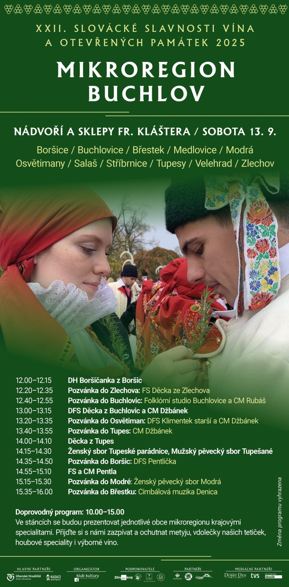 Na více než dvaceti venkovních stanovištích se o chutě a zážitky návštěvníků postarají nejen lokální vinaři, ale také hosté z dalších známých vinařských obcí Slovácka. Atmosféru doladí vystoupení cimbálových muzik a dalších hudebních uskupení, jejichž tóny budou znít napříč celým areálem. A jako každý rok platí – vstup na akci je zdarma (sobota, od 14:00 hodin, Vinohradská ulice).