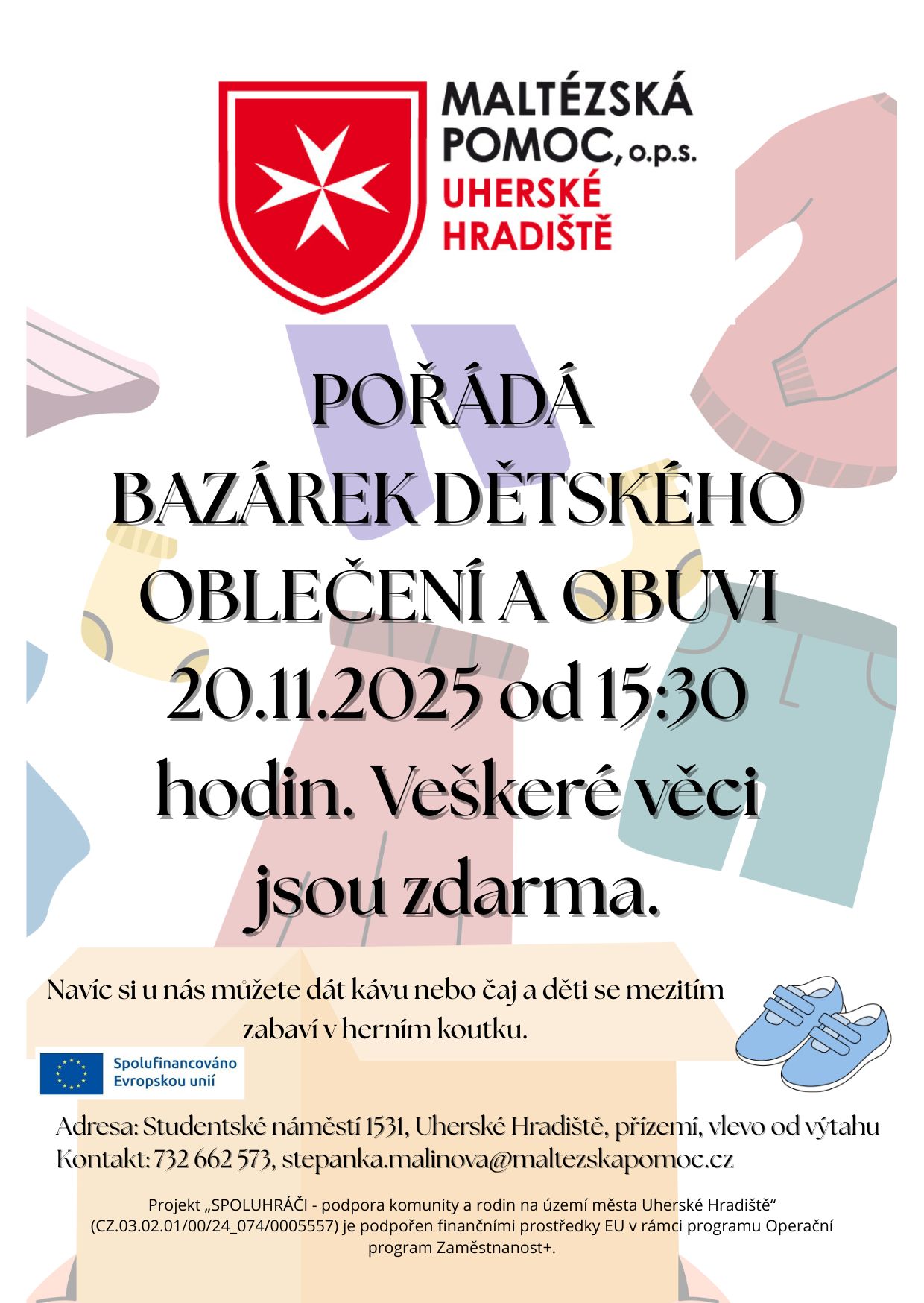Maltézská pomoc v Uherském Hradišti pořádá bazar dětského oblečení, obuvi a hraček. Veškeré věci si můžete odnést zdarma, přijďte se seznámit s našimi prostory a něco hezkého si vybrat pro vaše děti. Během akce bude k dispozici herní koutek pro děti a také možnost drobného občerstvení.