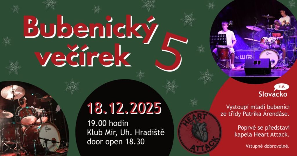Další pokračování přehlídky mladých bubenických nadějí z líhně ZUŠ Slovácko pod pečlivým dohledem pana vyučujícího Patrika Árendáše. Součástí večera bude i první veřejné vystoupení mladičké kapely Heart Attack. Vstupné doborvolné.