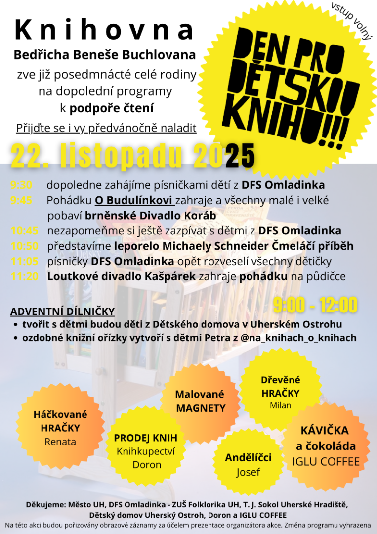 Děkujeme: Město UH, DFS Omladinka – ZUŠ Folklorika UH, T. J. Sokol Uherské Hradiště, Dětský domov Uherský Ostroh, Knihkupectví Doron a IGLU COFFEE