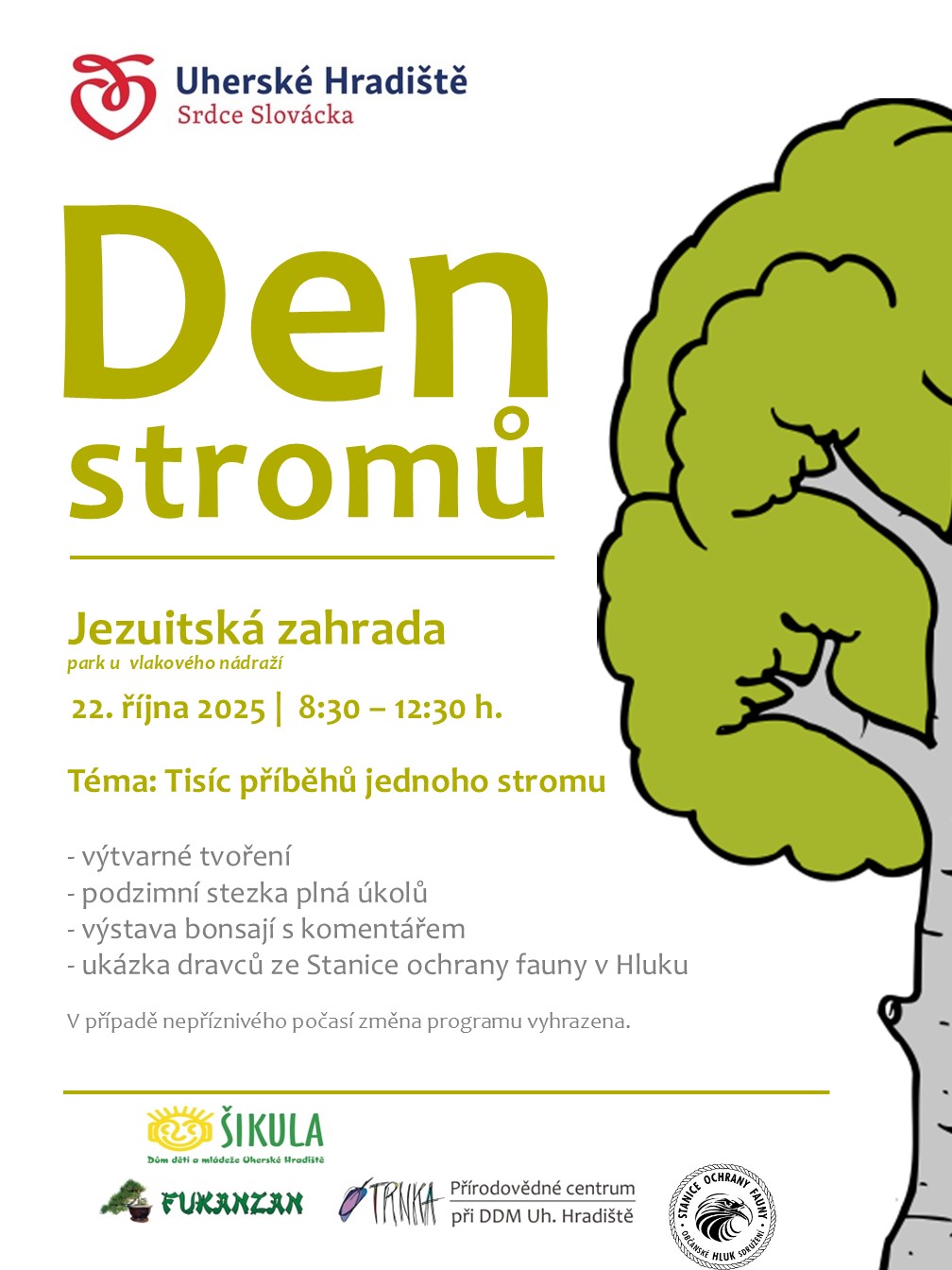 Téma: Tisíc příběhů jednoho stromu. Děti čeká výtvarné tvoření, podzimní stezka plná úkolů, výstava bonsají s komentářem, ukázka dravců ze Stanice ochrany fauny v Hluku.
