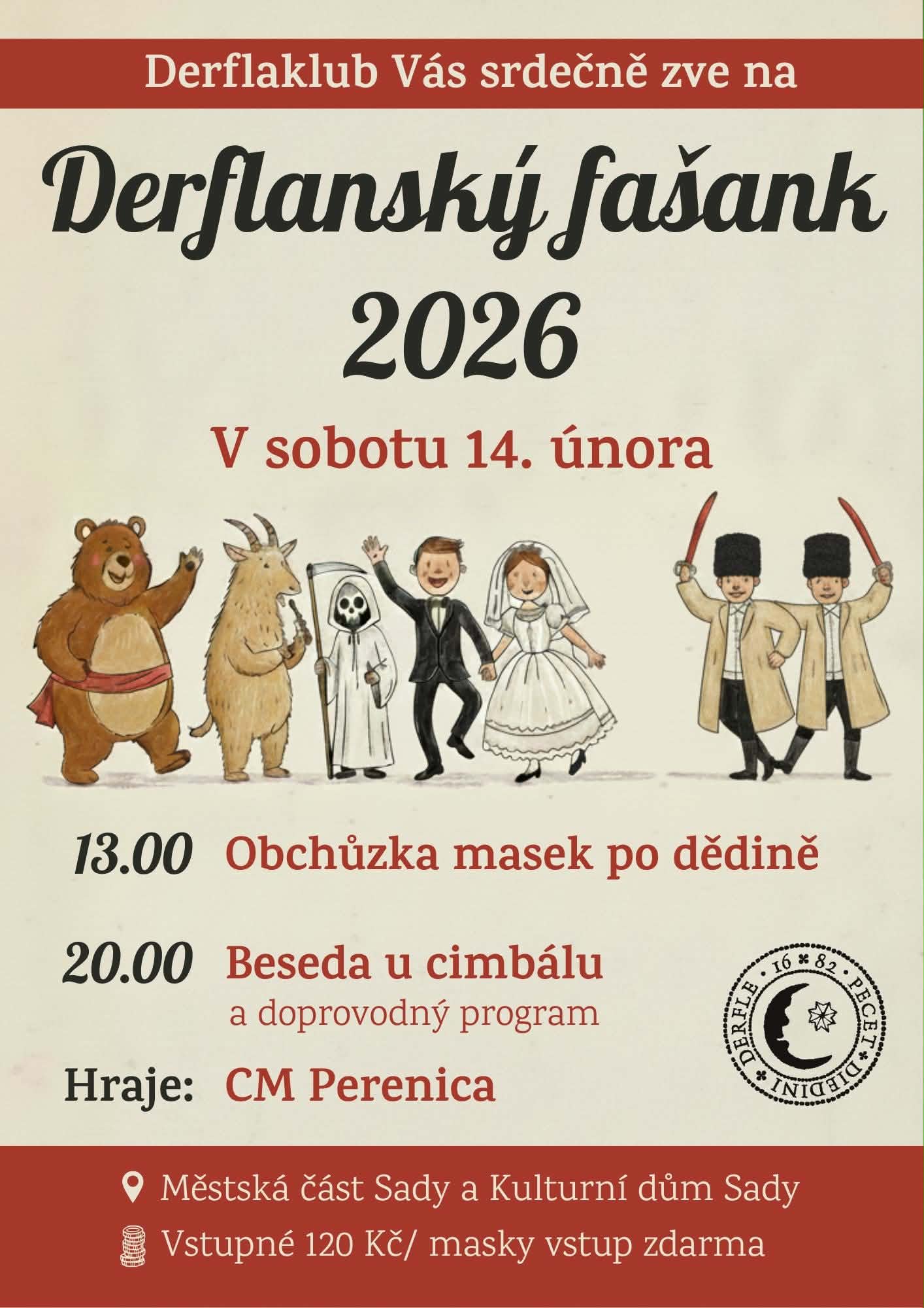 V sobotu 14. 2. se bude konat každoroční fašank a my budeme moc rádi, když se toho našeho derflanského zúčastníte nebo se alespoň přijdete podívat - ať už na fašankový průvod, či večerní zábavu.