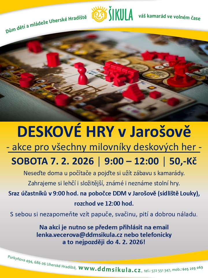 Deskové hry pro všechny milovníky logických, strategických i jiných zábavných her. Neseďte doma u počítače a přijďte si zahrát s kamarády. Akce je určena pro děti, ale i jejich rodiče.