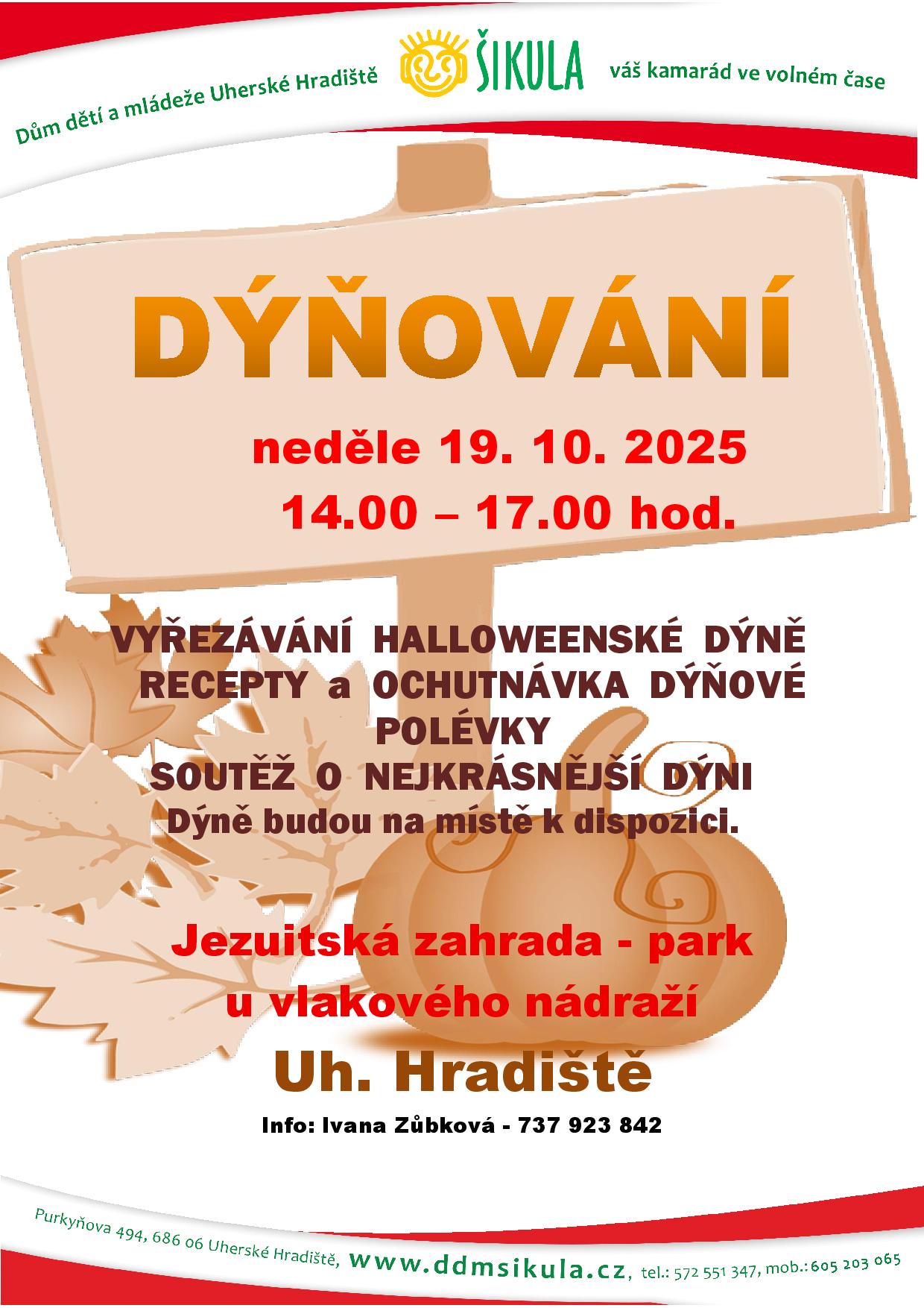 Dýňování - vyřezávání dýní, ochutnávka dýňové polévky, SOUTĚŽ. Dýně budou k dispozici na místě za poplatek.