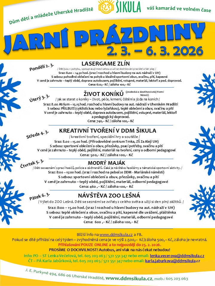 Jarní prázdniny se Šikulou pro děti školního věku. Každý den zajímavý program, výlety, soutěže, hry, aktivity s ostatními kamarády.