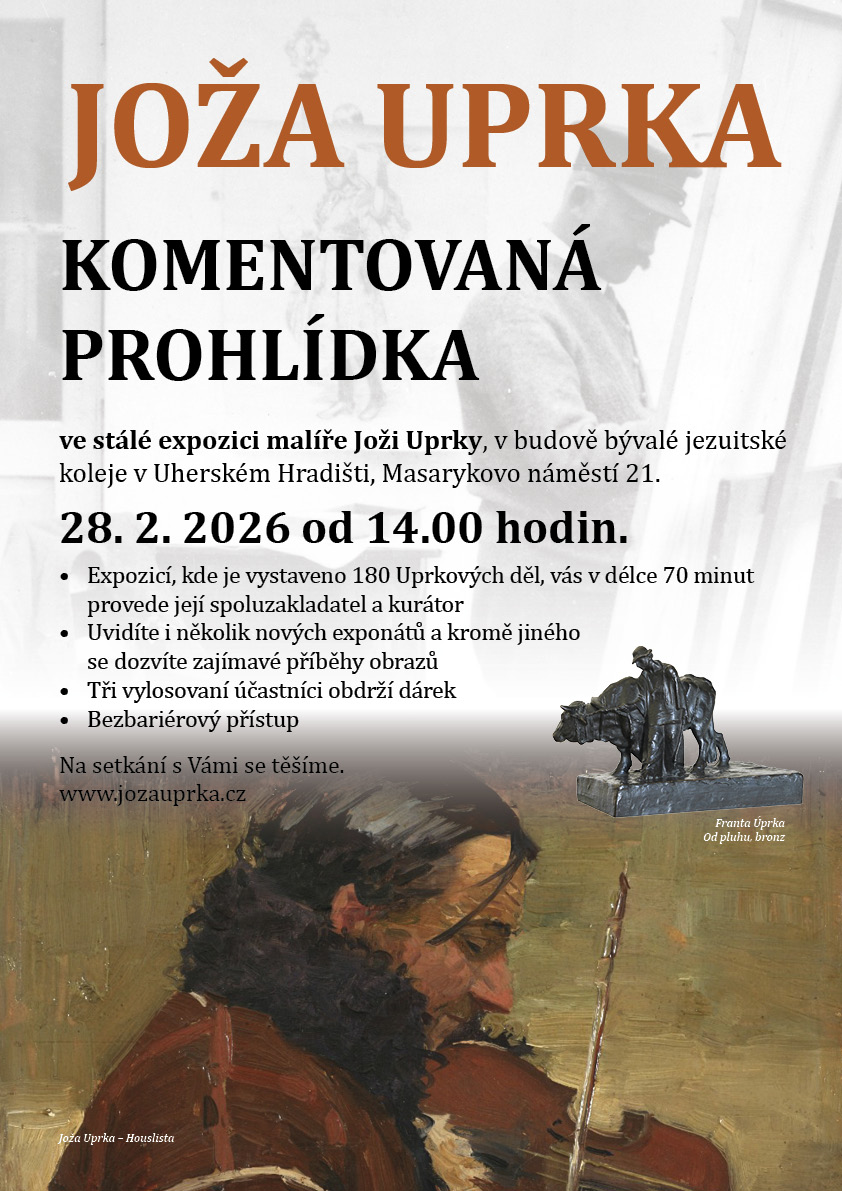 Galerie Joži Uprky v Uherském Hradišti nabízí unikátní příležitost milovníkům výtvarného umění a historie, navštívit jednu z největších expozic jednoho malíře 19. a 20. století v Evropě. Na ploše 1200m2, ve 12 výstavních sálech je vystaveno 180 děl tohoto svébytného malíře . Některé jeho obrazy patří mezi stěžejní díla klasické české malby. Komentovaná prohlídka proběhne 28.2.2026 od 14.00 hod. za účasti kurátora a spoluzakladatele Galerie Joži Uprky.