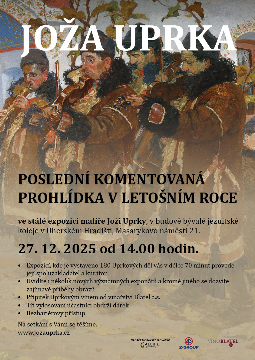 Srdečně Vás zveme na poslední komentovanou prohlídku v letošním roce do stálé expozice malíře Joži Uprky, kde je vystaveno 180 Uprkových děl. Uvidíte i několik nových významných exponátů. Prohlídkou Vás provede spoluzakladatel a kurátor galerie. Na závěr komentované prohlídky bude přípitek Uprkovým vínem od vinařství Blatel a.s.