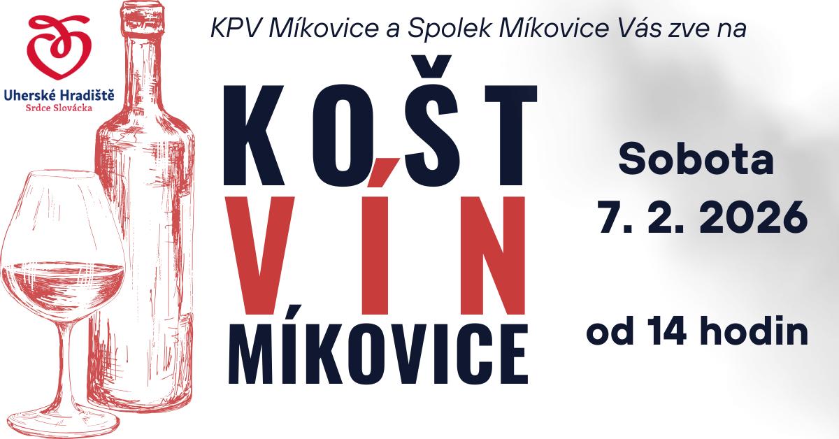 V sobotu 7. 2. 2026 se koná již 39. ročník tradičního koštu vín v Míkovicích. Akce začíná ve 14 hodin na KD Míkovice. V ceně vstupného 400 Kč je sklenička, katalog vín a neomezená konzumace vystavených vín. K dobré náladě zahraje cimbálová muzika a goralská muzyka. Dále je připraveno i bohaté občerstvení od lokálních výrobců.