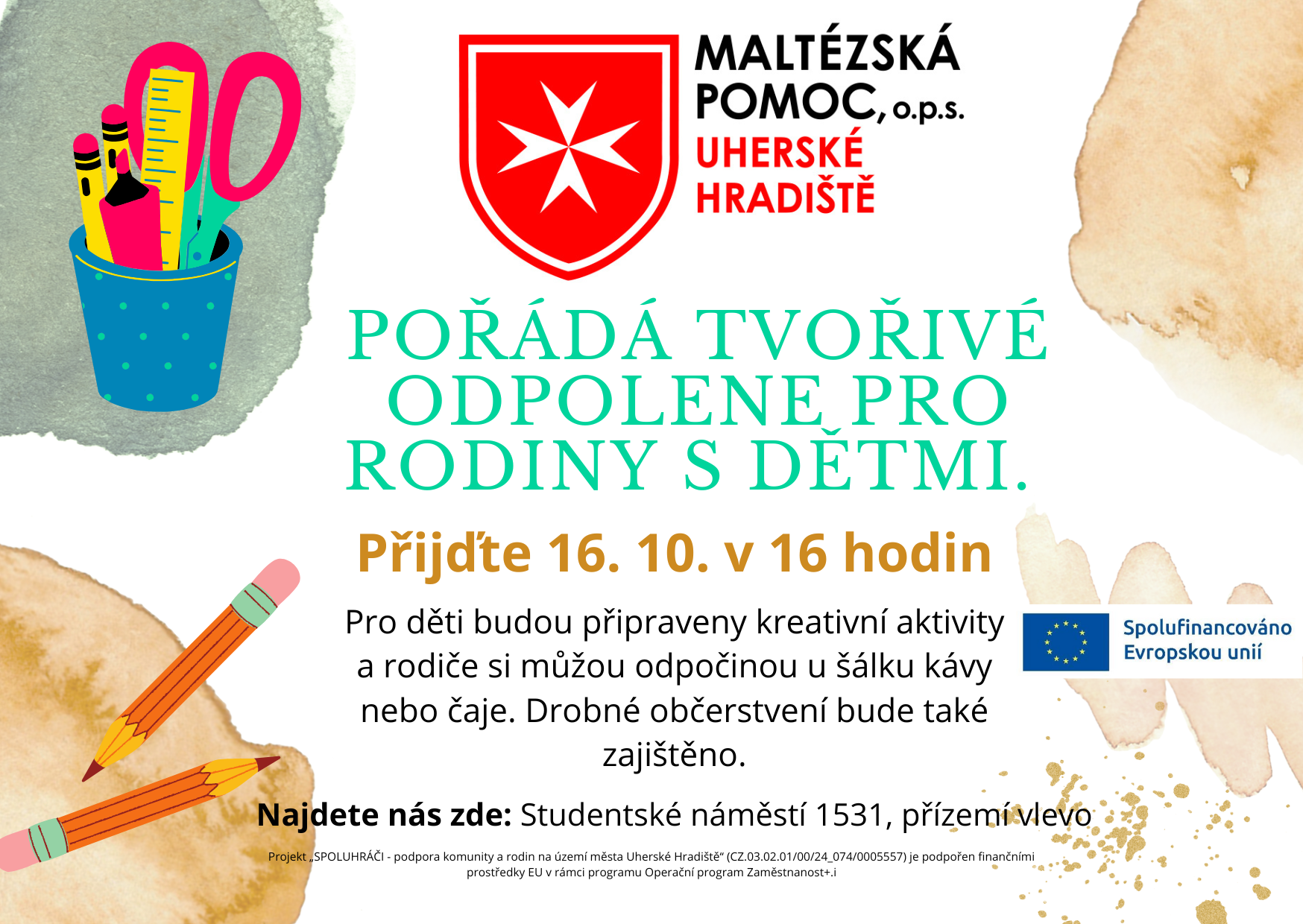 Zveme vás na podzimní tvoření pro rodiny s dětmi v prostorách Maltézské pomoci v Uherském Hradišti. Pro děti budou připravené kreativní aktivity a rodiče si můžou odpočinout při šálku kávy nebo čaje. Drobné občerstvení zajištěno.