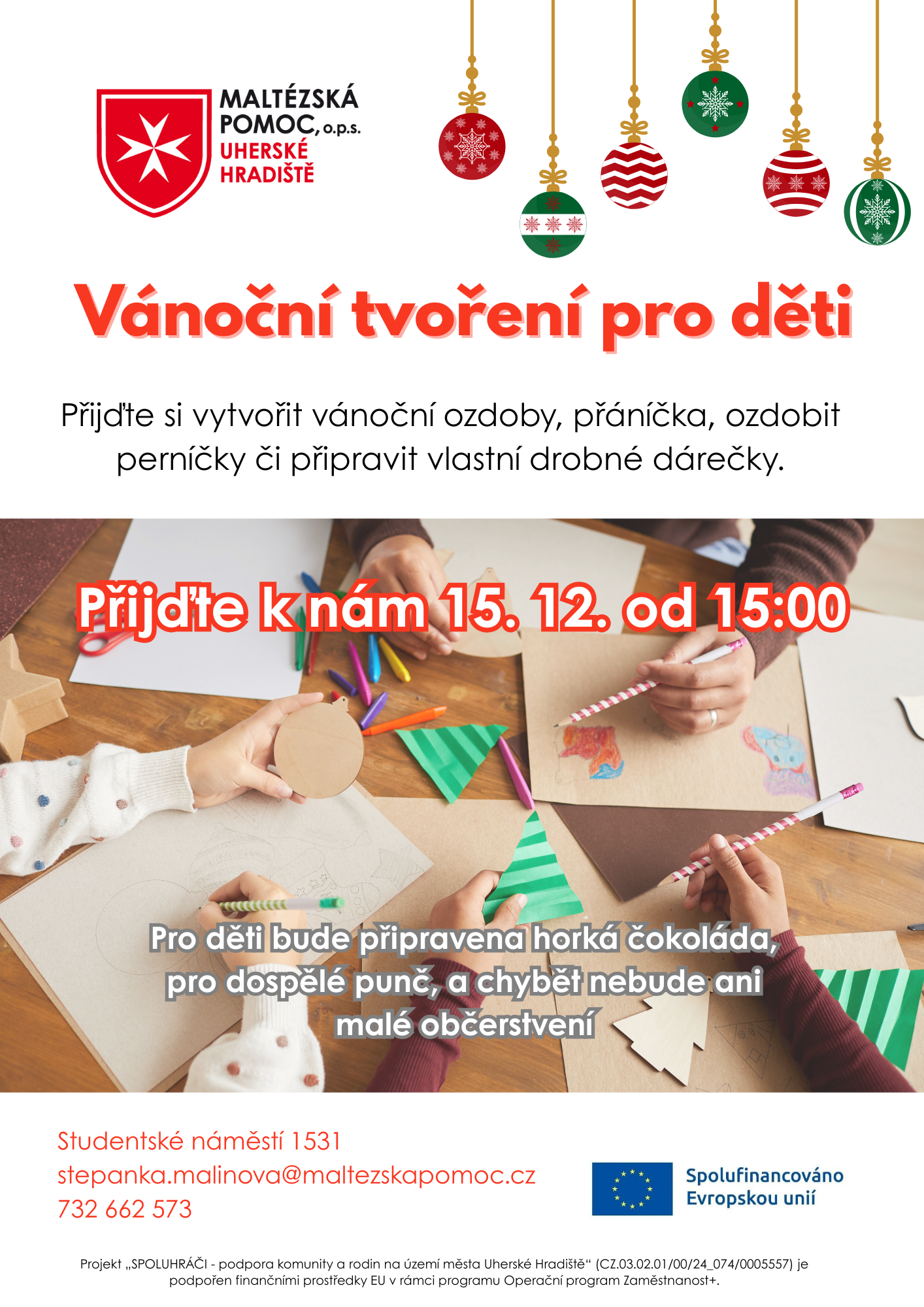 Maltézská pomoc zve rodiny s dětmi na předvánoční tvoření. Budeme vyrábět ozdoby, přáníčka, zdobit perníčky a vyrábět vlastní malé dárečky. Nebude chybět ani malé občerstvení v podobě horké čokolády pro děti a punče pro dospělé. Přijďte se vánočně naladit.