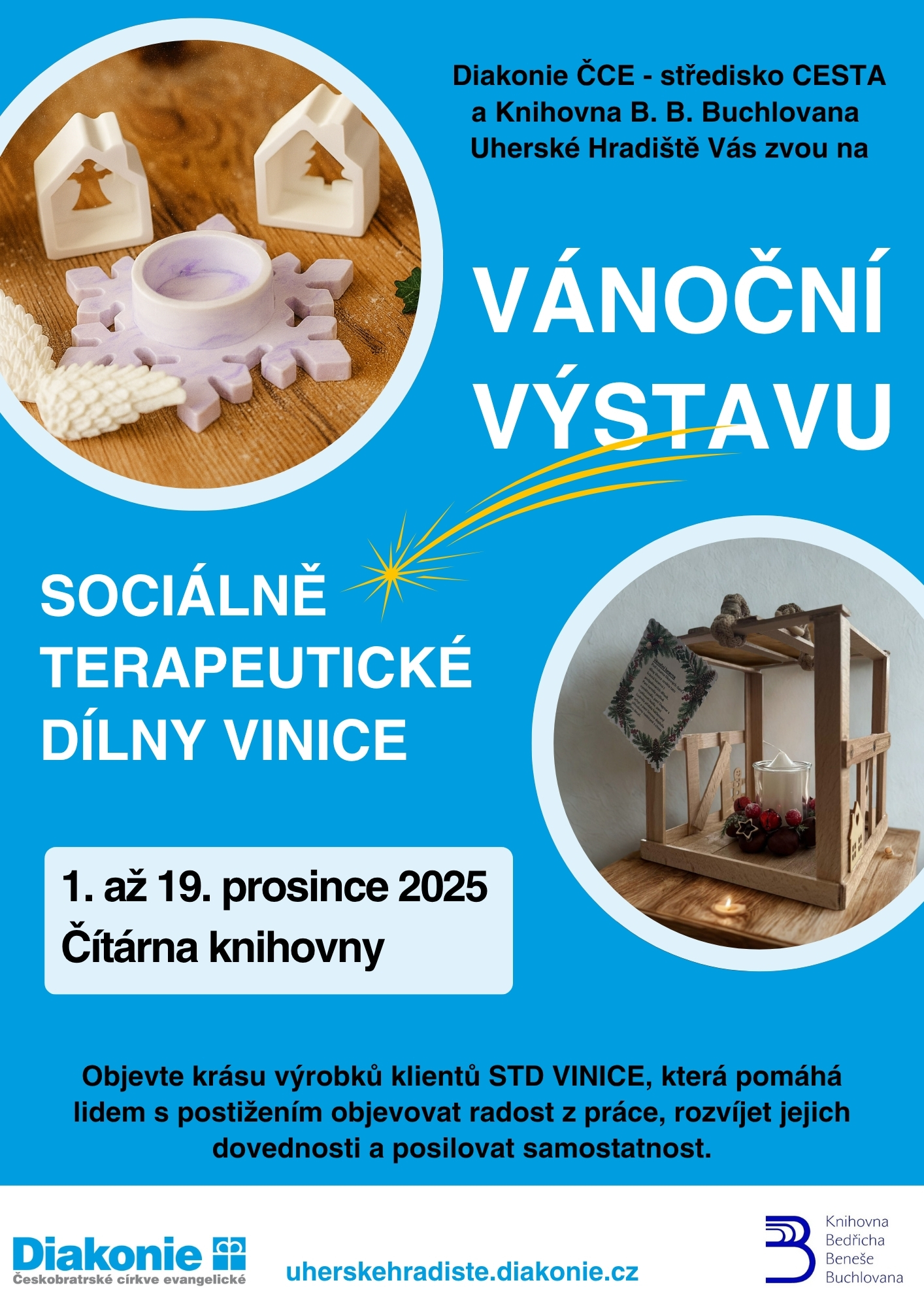 Diakonie ČCE - středisko CESTA a Knihovna B. B. Buchlovana Uherské Hradiště si Vás dovolují pozvat na výstavu výrobků klientů Sociálně terapeutické dílny VINICE.