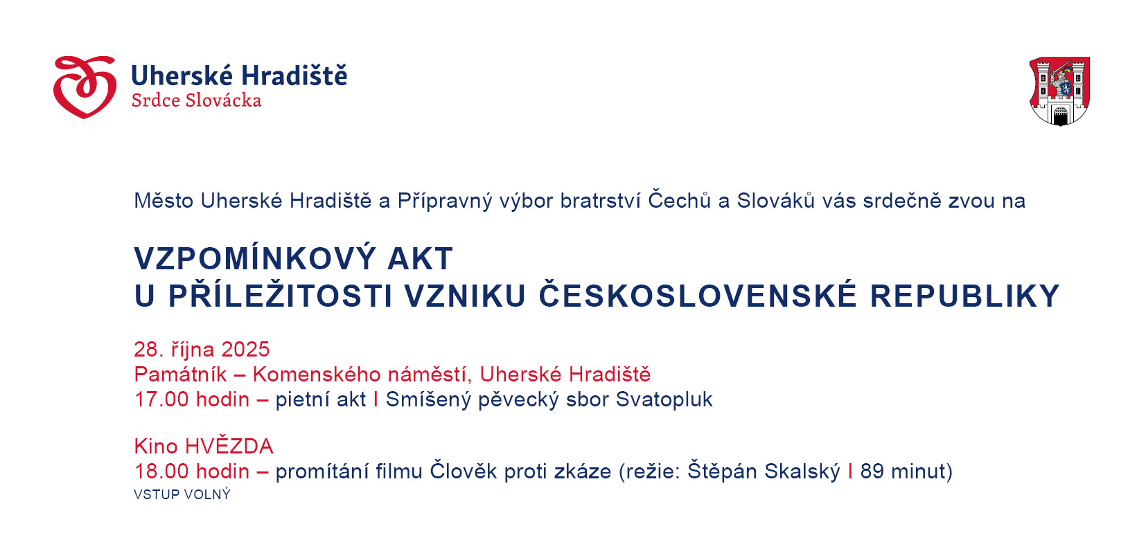 Město Uherské Hradiště a Přípravný výbor bratrství Čechů a Slováků zvou na vzpomínkový akt u příležitosti vzniku Československé republiky, který se uskuteční v úterý 28. října v 17.00 u památníku na Komenského náměstí. V rámci pietního aktu vystoupí smíšený pěvecký sbor Svatopluk. Od 18.00 pak bude v kině Hvězda promítnut film Člověk proti zkáze, vstup na promítání je volný.